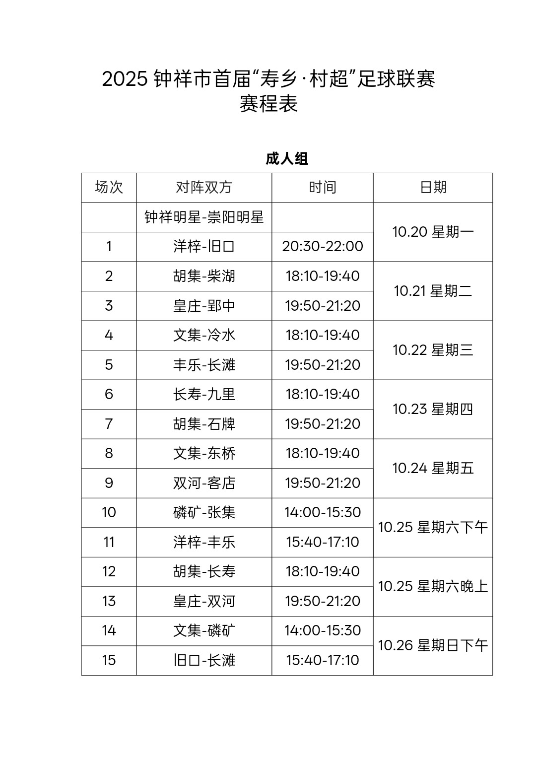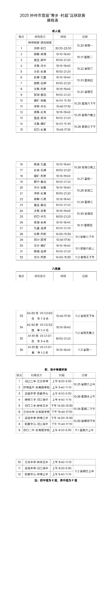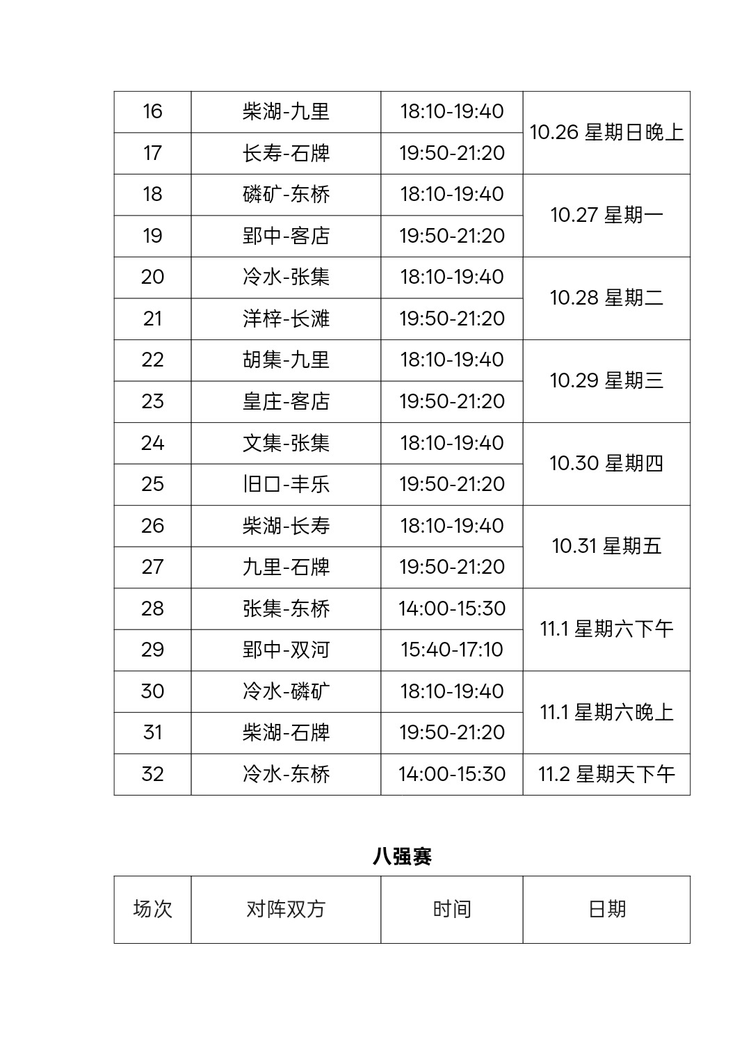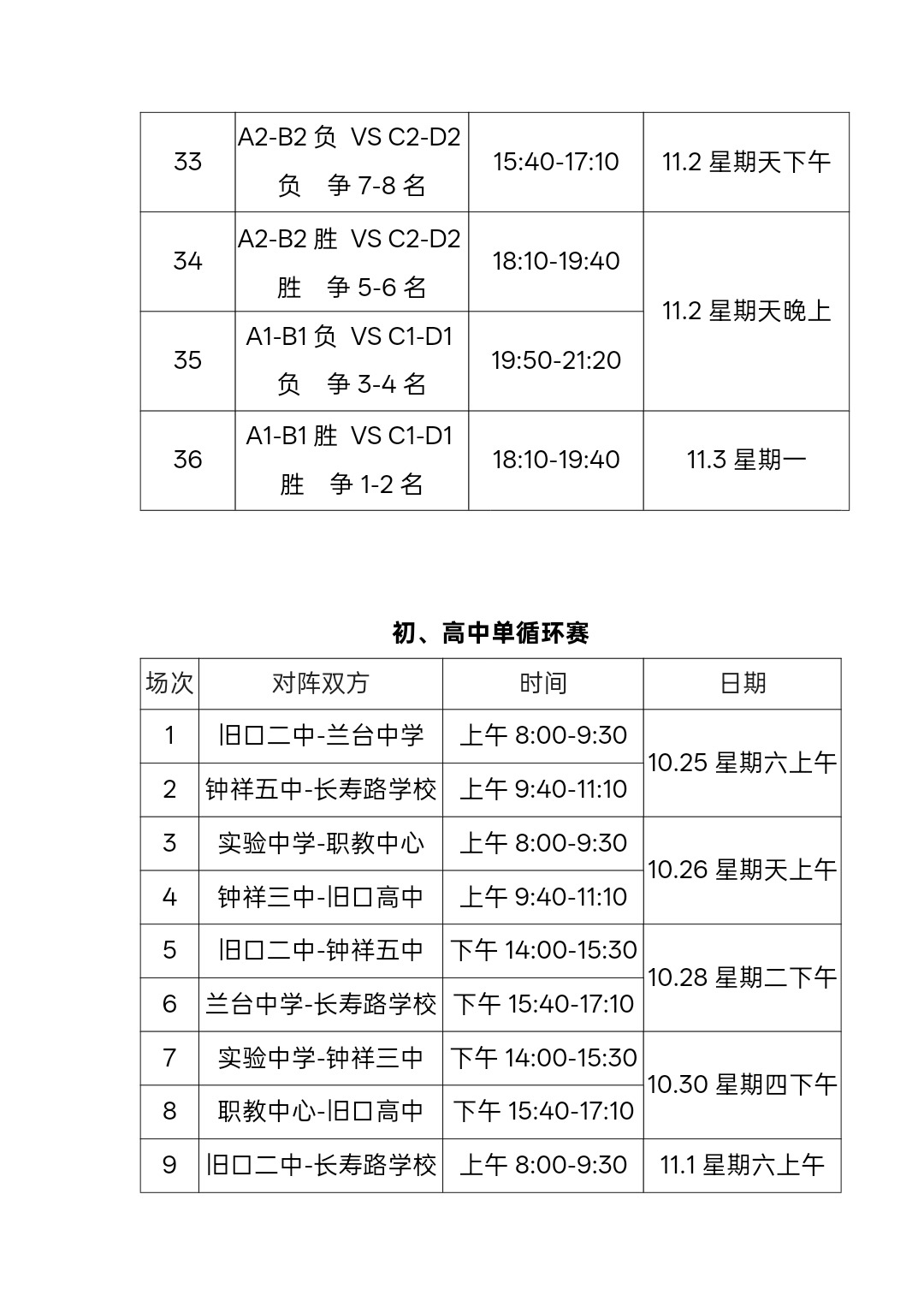 成人组场次对阵双方时间日期钟祥明星-崇阳明星10.20星期一1洋梓-旧口20:30-22:002胡集-柴湖18:10-19:4010.21星期二3皇庄-郢中19:50-21:204文集-冷水18:10-19:4010.22星期三5丰乐-长滩19:50-21:206长寿-九里18:10-19:4010.23星期四7胡集-石牌19:50-21:208文集-东桥18:10-19:4010.24星期五9双河-客店19:50-21:2010磷矿-张集14:00-15:3010.25星期六下午11洋梓-丰乐15:40-17:1012胡集-长寿18:10-19:4010.25星期六晚上13皇庄-双河19:50-21:2014文集-磷矿14:00-15:3010.26星期日下午15旧口-长滩15:40-17:1016柴湖-九里18:10-19:4010.26星期日晚上17长寿-石牌19:50-21:2018磷矿-东桥18:10-19:4010.27星期一19郢中-客店19:50-21:2020冷水-张集18:10-19:4010.28星期二21洋梓-长滩19:50-21:2022胡集-九里18:10-19:4010.29星期三23皇庄-客店19:50-21:2024文集-张集18:10-19:4010.30星期四25旧口-丰乐19:50-21:2026柴湖-长寿18:10-19:4010.31星期五27九里-石牌19:50-21:2028张集-东桥14:00-15:3011.1星期六下午29郢中-双河15:40-17:1030冷水-磷矿18:10-19:4011.1星期六晚上31柴湖-石牌19:50-21:2032冷水-东桥14:00-15:3011.2星期天下午八强赛场次对阵双方时间日期33A2-B2负 VS C2-D2负 争7-8名15:40-17:1011.2星期天下午34A2-B2胜 VS C2-D2胜 争5-6名18:10-19:4011.2星期天晚上35A1-B1负 VS C1-D1负 争3-4名19:50-21:2036A1-B1胜 VS C1-D1胜 争1-2名18:10-19:4011.3星期一初、高中单循环赛场次对阵双方时间日期1旧口二中-兰台中学上午8:00-9:3010.25星期六上午2钟祥五中-长寿路学校上午9:40-11:103实验中学-职教中心上午8:00-9:3010.26星期天上午4钟祥三中-旧口高中上午9:40-11:105旧口二中-钟祥五中下午14:00-15:3010.28星期二下午6兰台中学-长寿路学校下午15:40-17:107实验中学-钟祥三中下午14:00-15:3010.30星期四下午8职教中心-旧口高中下午15:40-17:109旧口二中-长寿路学校上午8:00-9:3011.1星期六上午10兰台中学-钟祥五中上午9:40-11:1011实验中学-旧口高中上午8:00-9:3011.2星期日上午12职教中心-钟祥三中上午9:40-11:10注:初中组为E组,高中组为F组 |