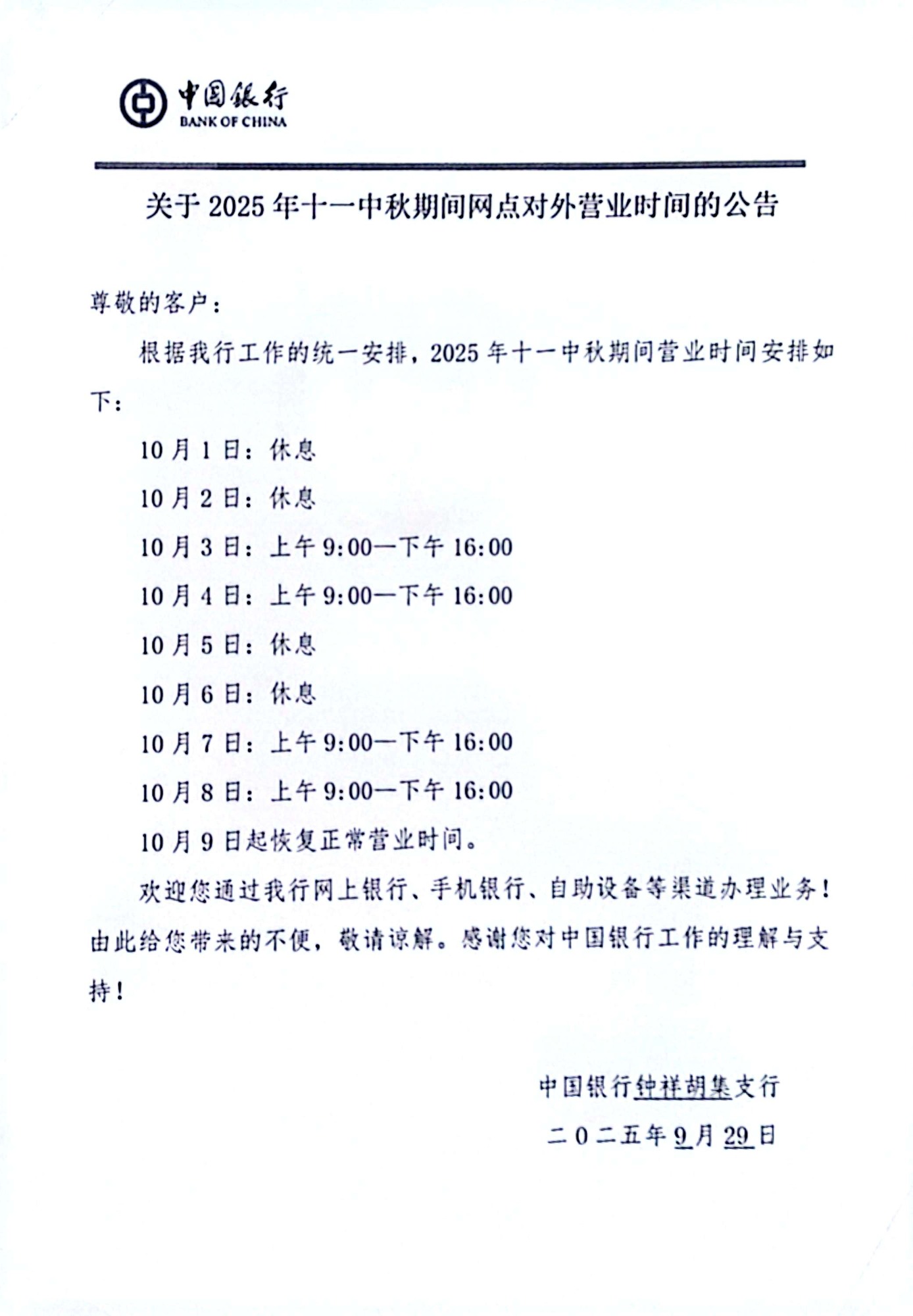 中国银行钟祥胡集支行二0二五年9月29日 |